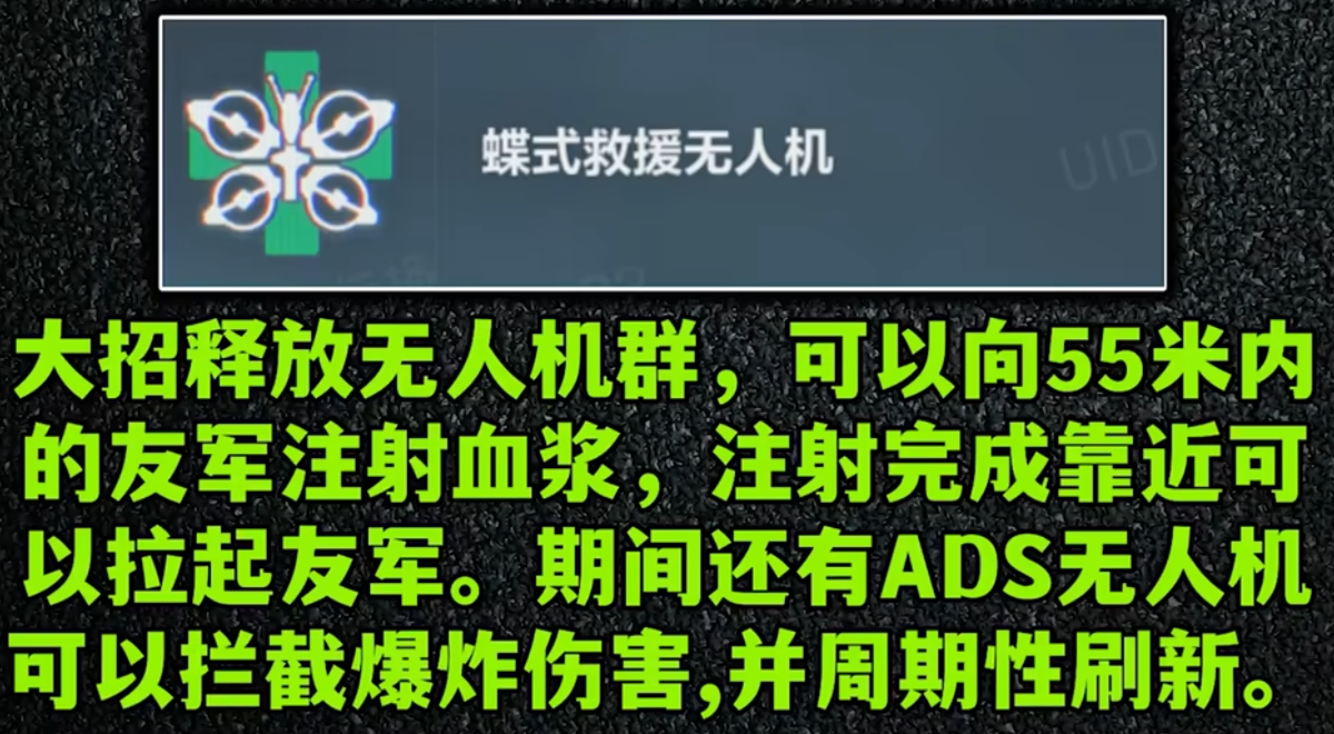 蝶的大招可以远程救人。使用无人机可以拉55米内的倒地队友,完成注射后需蝶主动靠近就可以直接完成救援,在此期间还能拦截一次爆炸伤害(威龙C4、红狼手炮等)。
