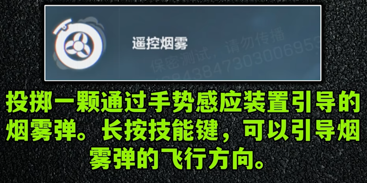超远距离遥控烟雾,长按技能可以引导飞行方向,最远可达100米。