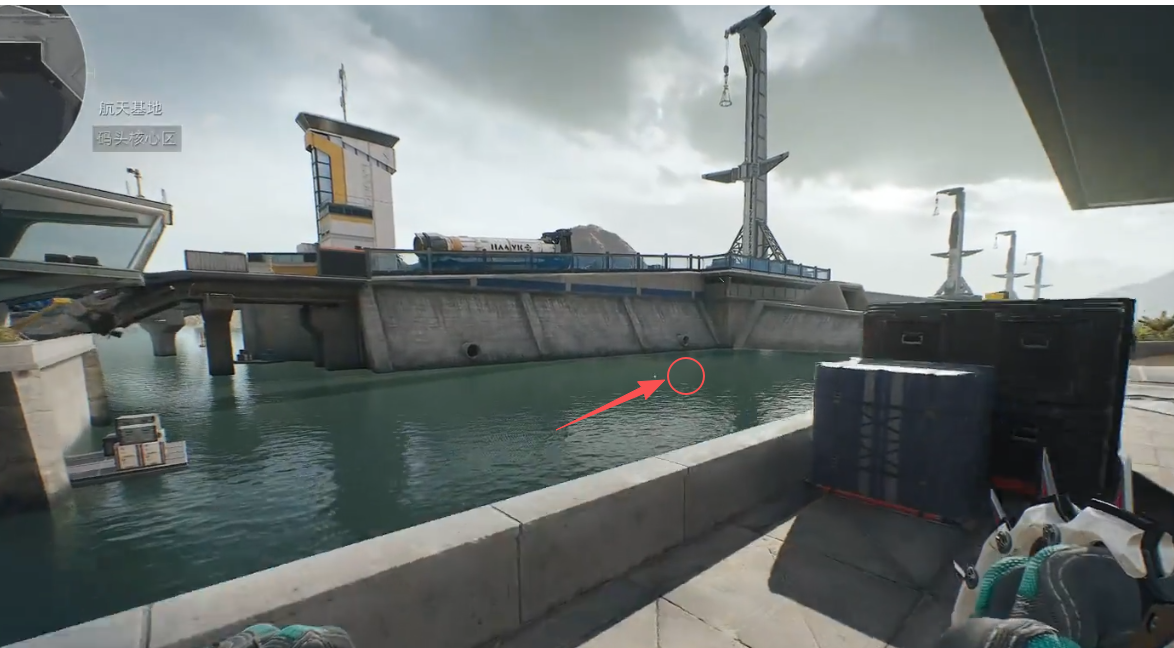 就在航天发射区的这个位置。跳下水,然后直接游到水下洞里,进入下水道。记住一定要快,航天2.0新增了鲨鱼,非常危险!
