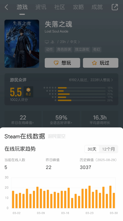 2026年3月30日,一则消息悄然发酵:曾被视为国产动作角色扮演游戏“希望之光”的《失落之魂》,在发售一年后已陷入近乎“空城”的窘境。数据显示,其Steam平台每日平均在线人数仅维持在20人左右,社区活跃度极低。而这款游戏自去年发售以来,历史最高在线人数也不过3037人。对于一款拥有索尼“中国之星”计划背书、承载无数玩家期待的作品而言,这份成绩单堪称惨淡。